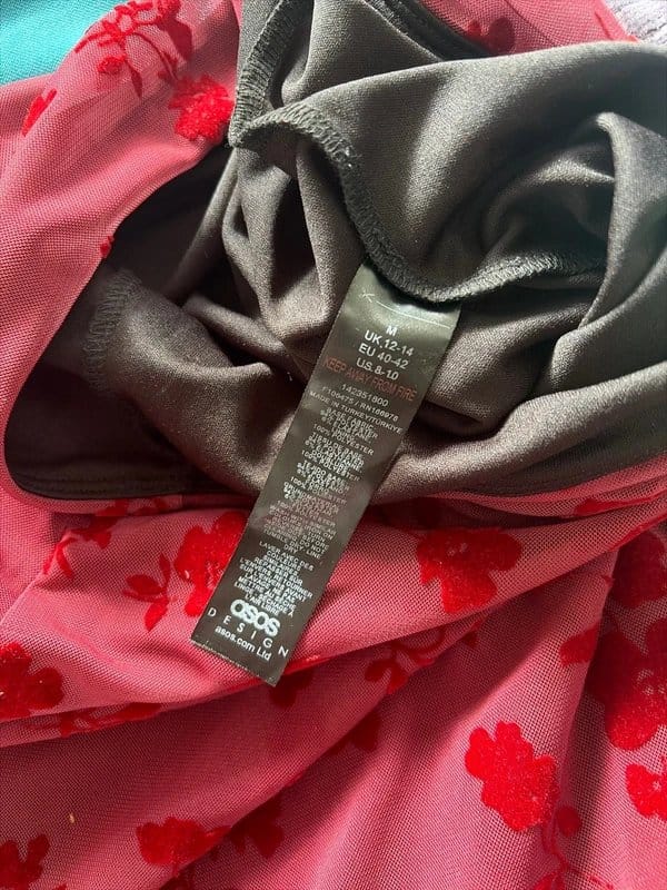 Trendy burgundy floral mesh skirt by ASOS. Features a stretchy fabric with a black underlay and can be worn at low waist or mid waist. Perfect for a vibrant and stylish look.