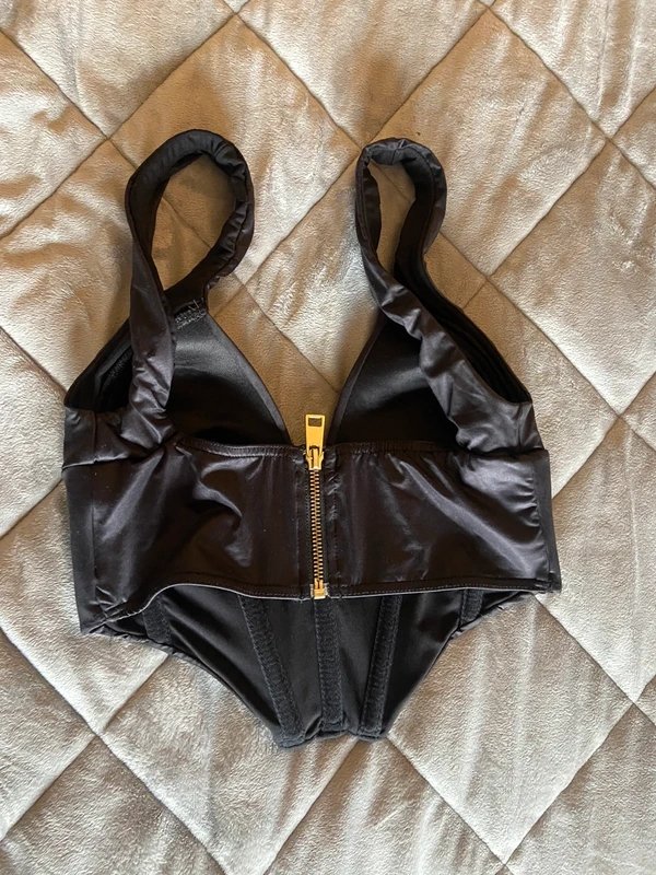Black Leather Look Bikini Top from ASOS - perfect for going out. Features a corset style with a gold zip on the back, true to size. Crafted from leather-look material for a sleek, sophisticated look.