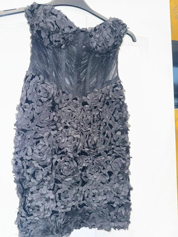 This black corset style mini dress by ASOS features a cinched waist for a flattering silhouette. The sheer floral overlay adds a touch of elegance, perfect for a night out.