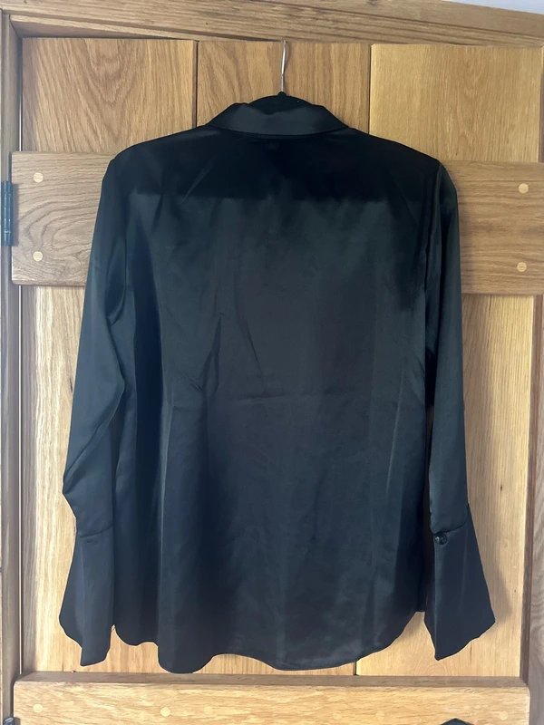 The ASOS Luxe Black Satin Shirt is available in sizes S.