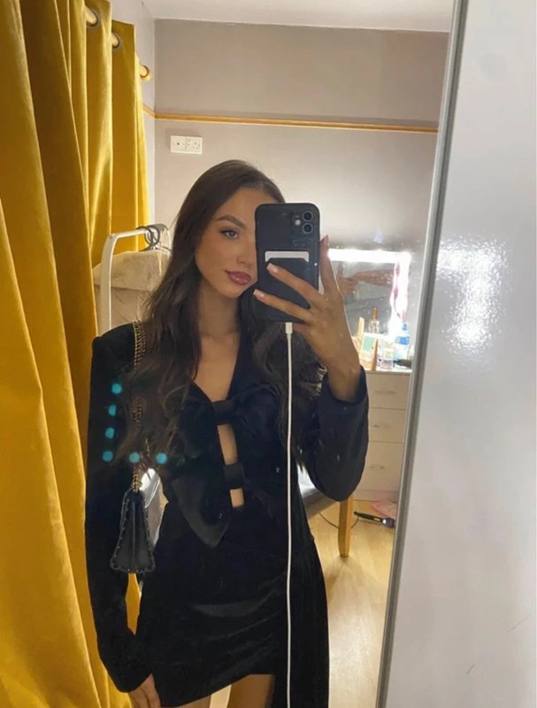 Embrace the allure of evening sophistication with this black mini dress. Crafted from luxurious velvet, it features a bow draped side detail for a touch of elegance.