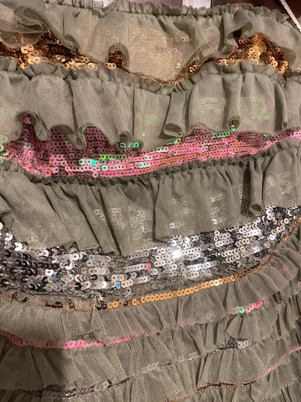 Absolutely stunning dress with tiny chiffon frills and sequins between. The strapless khaki dress is perfect for party occasions, crafted from chiffon and sequin materials. It features a gorgeous, embellished look with a flattering fit.