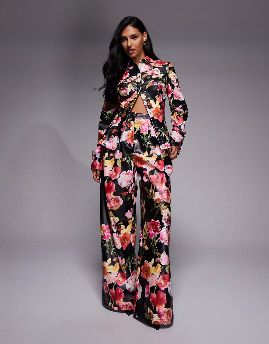 The ASOS LUXE Floral Print PU Shirt and Wide Leg Trousers is ideal for casual, evening, party.