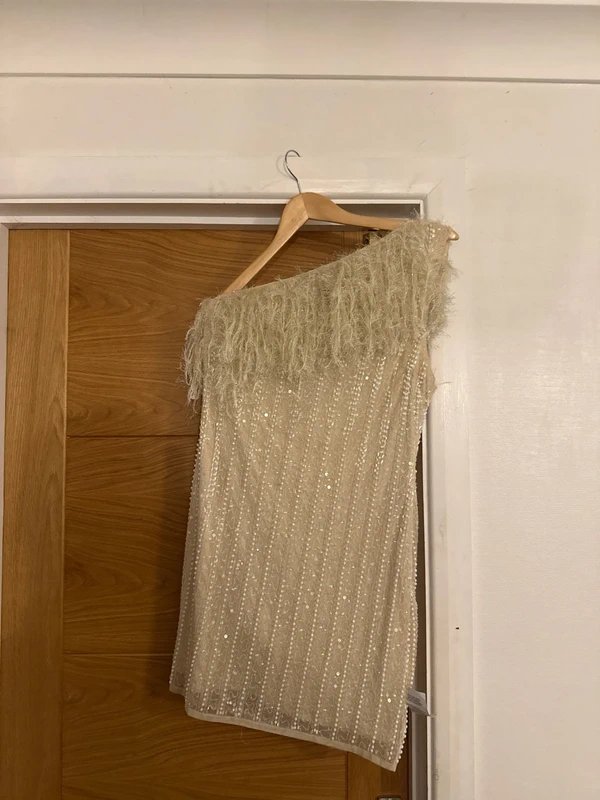 The ASOS Luxe Cream Ivory Beaded Embellished Sequin One Shoulder Feather Trim Party Mini Dress is available in sizes M.