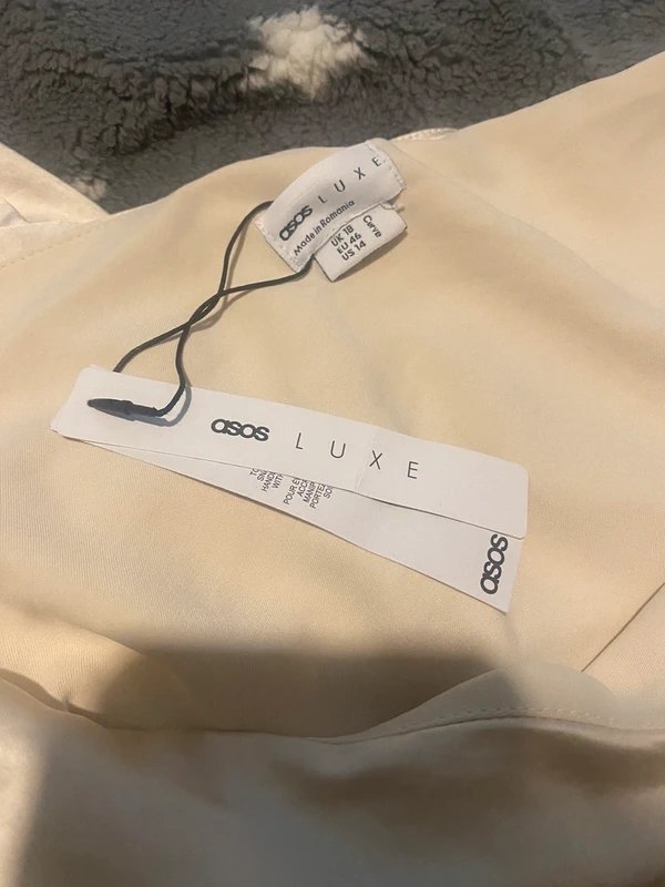 The ASOS Luxe Cream Satin Off-Shoulder Long Sleeve Dress is made from satin.