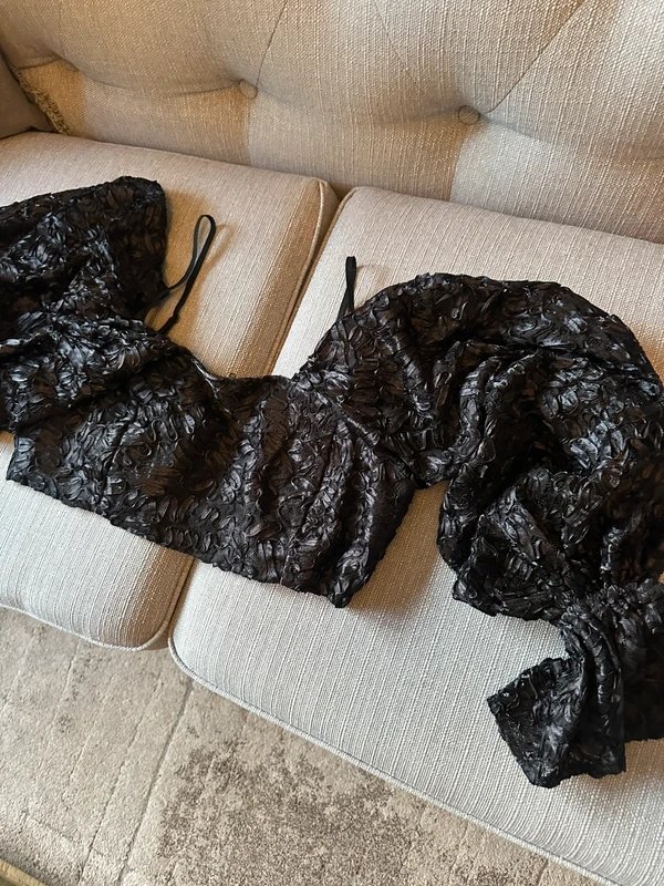 The ASOS Luxe Black 3D Lace Bardot Crop Top is available in sizes XL.