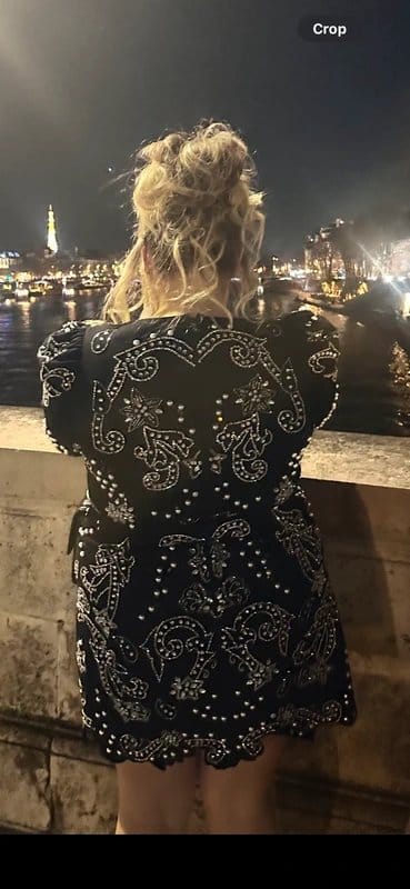 Stunning black embellished mini dress with sequins, pearls, and rhinestones. Features a zip closure on the back and sleeve. True to size, fits comfortably on a size 20 but also suitable for a size 18.