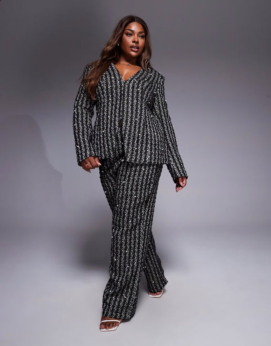 Crafted with black, full-length sleeves, and sequin embellishments, this boucle trouser co-ord from ASOS Luxe Curve adds a touch of glamour to your wardrobe. Perfect for evening outings or formal events.