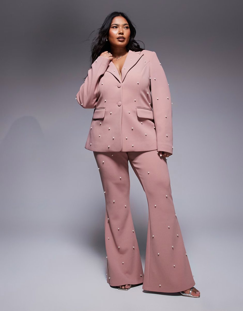 The ASOS LUXE Curve Dusty Rose Pearl Embellished Blazer and Trouser Co-ord is available in sizes XXXL, XXL, XL, XS, L, M, S.