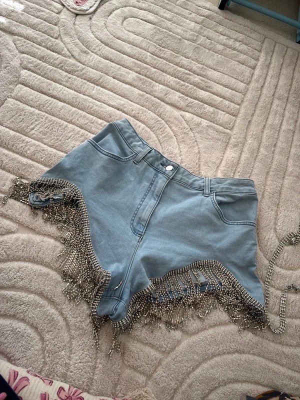 The ASOS Luxe Denim Fringe Shorts in Light Blue is available in sizes L.