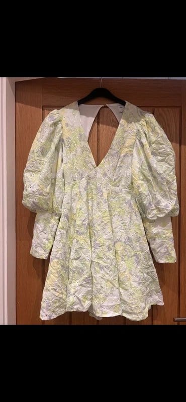 This ASOS mint puff sleeve dress features a backless design and a floral print. Made from a lightweight textured fabric, it has a gathered skirt and puff sleeves for a playful yet elegant look. Perfect for special occasions.