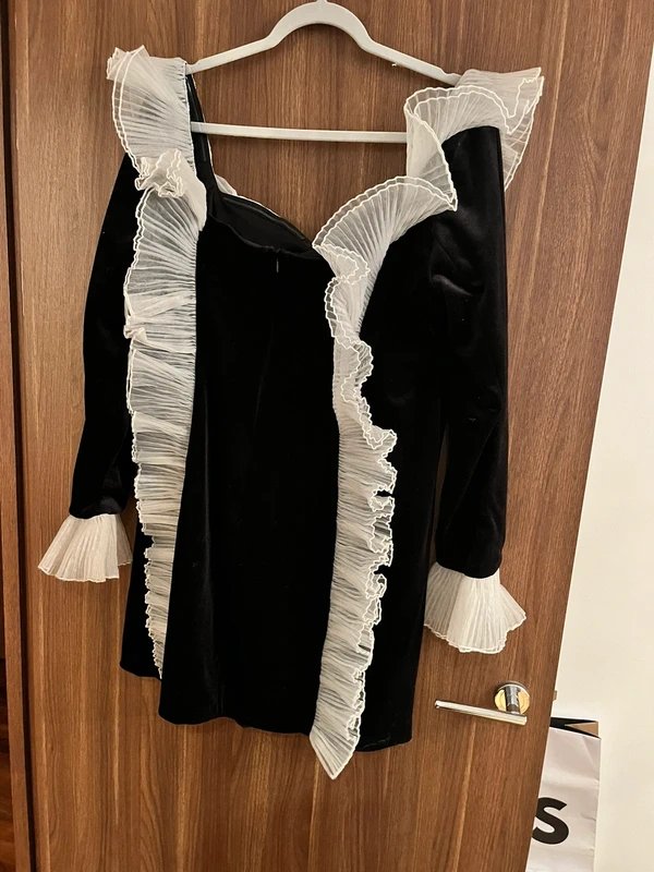 Elegant black and white velvet off-the-shoulder party dress from ASOS Luxe. Perfect for special occasions, this dress features a flowing silhouette with ruffled detailing and long sleeves.