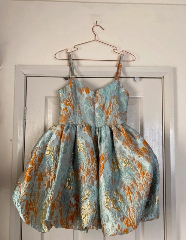 This lovely corset bubble dress from ASOS features a unique Turquoise and gold design. It has a fitted bodice with a straps neckline, perfect for an elegant yet playful look.