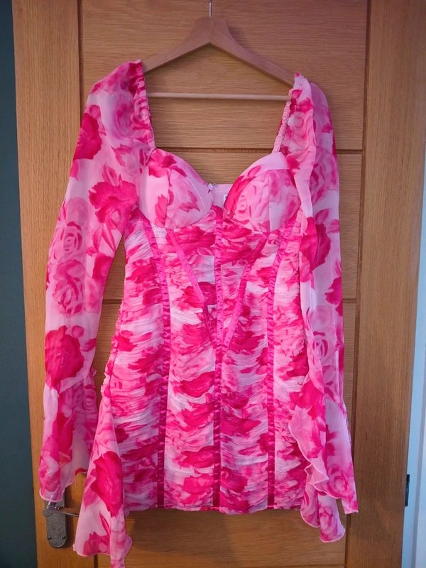 The ASOS Luxe Pink Floral Bandage Dress is available in sizes S.