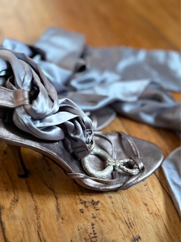 Barely worn in immaculate condition, these gorgeous sandals are perfect for a wedding or formal occasion. Very comfortable and the satin ties can be worn in several ways.