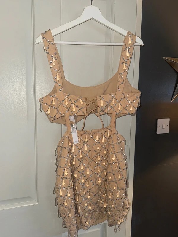 Apricot Mini Dress with Jewel Embellishments — perfect for special occasions like birthdays, hen dos, and Christmas night. This mini dress features a cut-out around the waist and a tie-up back to tighten around the chest area. Crafted from thick twill material with sequin and jewel droplets for a stunning look.