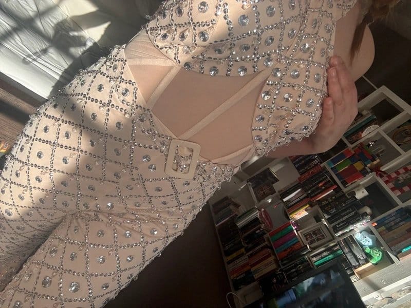 The ASOS Luxe Embellished Jumpsuit in Beige and Silver is ideal for evening, party.