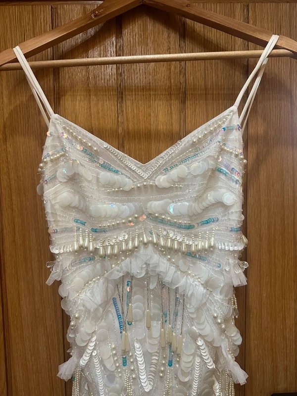 A stunning embellished dress perfect for evening events. Crafted with intricate details, it features a cream hue that enhances its elegance.