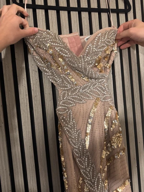 A stunning gown by ASOS, crafted with intricate beaded details that add a touch of glamour. The chiffon fabric flows beautifully, making it perfect for special occasions.
