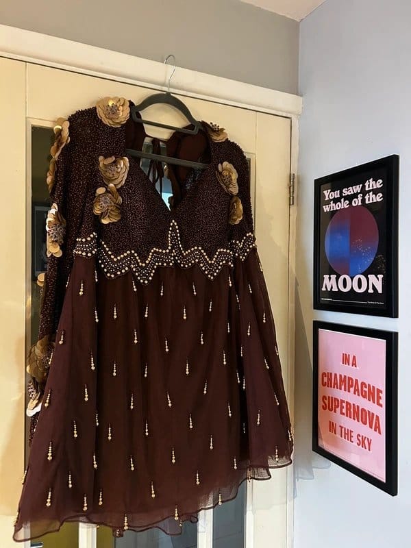 The ASOS Luxe Embellished Mini Dress with 3D Flowers in Brown is made from fabric, embroidery, beading.