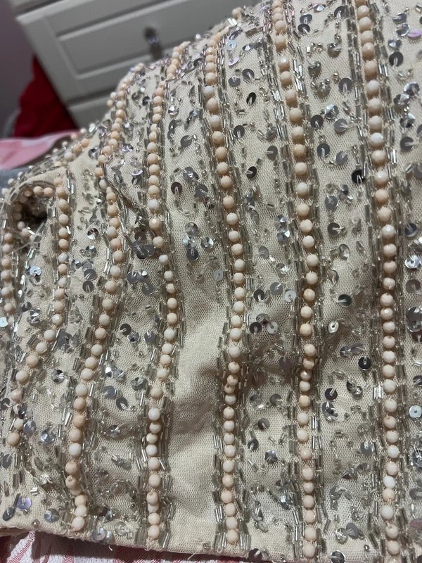 Blush pink embellished feather top with one sleeve. Features a one-shoulder neckline and a fitted silhouette. Crafted from lightweight chiffon with sequins and beads, it adds a touch of glamour to any outfit. Perfect for special occasions and evening events.