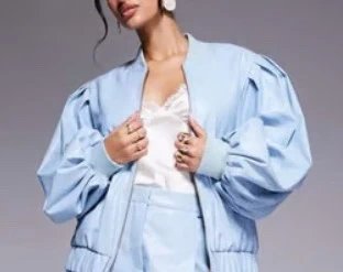 Crafted with a chic faux leather finish, this light blue bomber jacket by ASOS features full-length sleeves and a zip closure for a modern, edgy look.