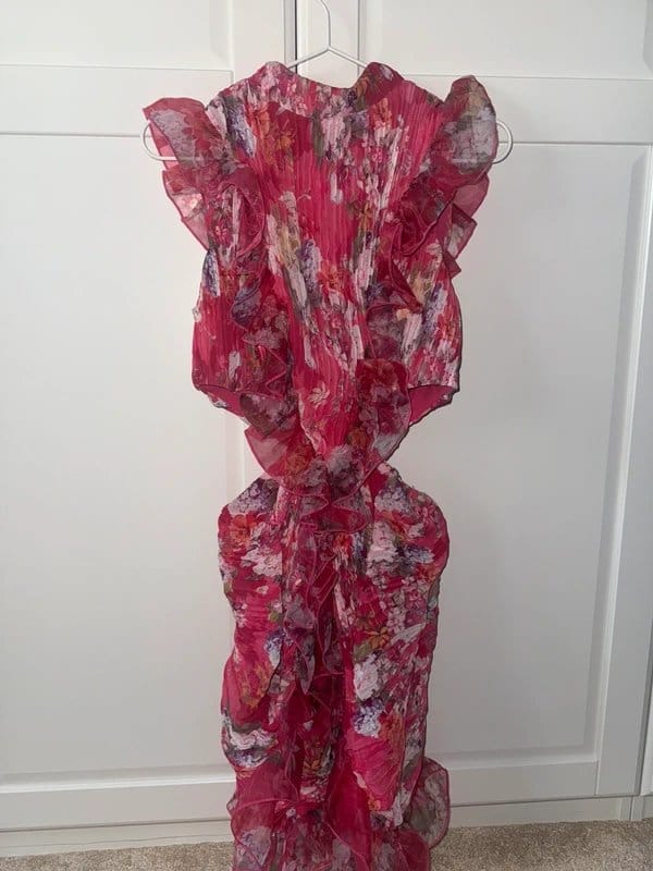 This ASOS Luxe dress features a stunning floral print in a pink hue. The dress has a flowing silhouette with multiple ruffled layers for a dramatic effect. Ideal for special occasions like a wedding guest appearance.
