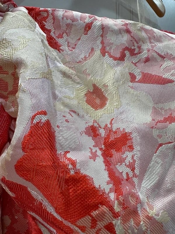 Beautiful ASOS Luxe mini dress in a romantic floral jacquard fabric with soft pink, cream, and red tones. Features a structured corset-style bodice with boning that cinches the waist, plus statement puff sleeves for a dramatic, feminine look.