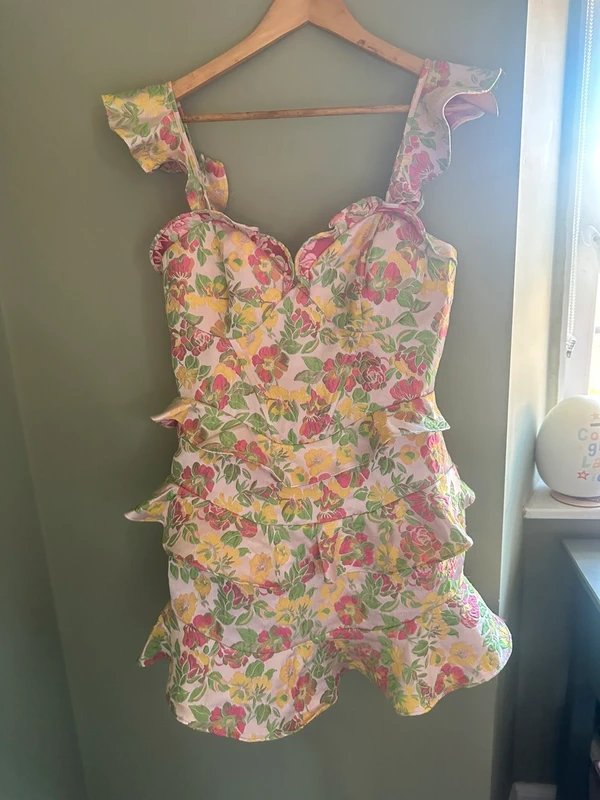 The ASOS Pink Floral Frill Dress is available in sizes M.