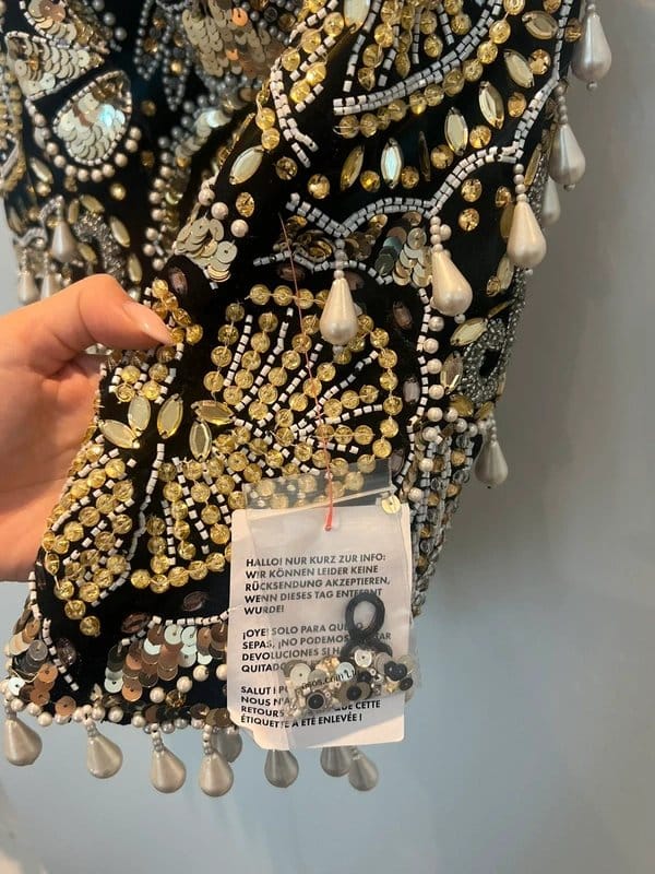 This black velvet mini skirt from ASOS LUXE is adorned with gem embellishments and drop pearls. It features a luxurious design perfect for evening events or special occasions.