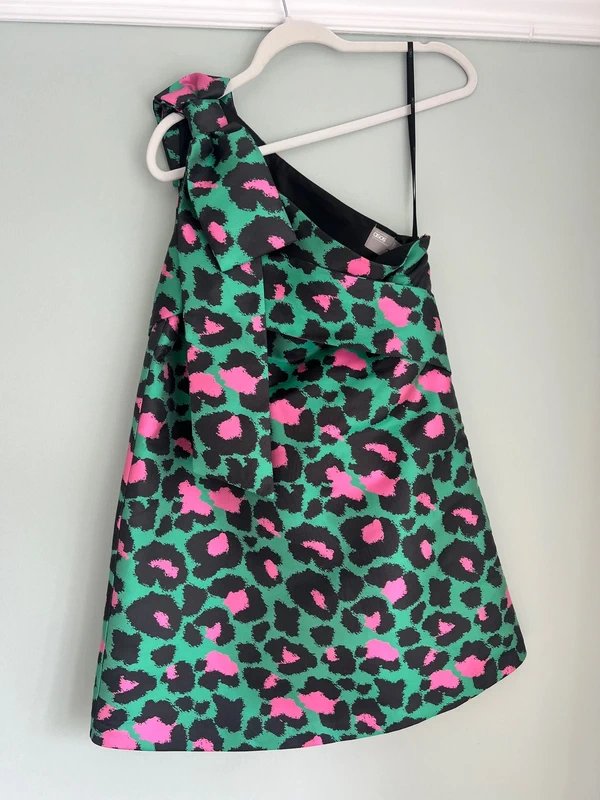 The ASOS Leopard Print One-Shoulder Dress in Pink and Green is available in sizes S.