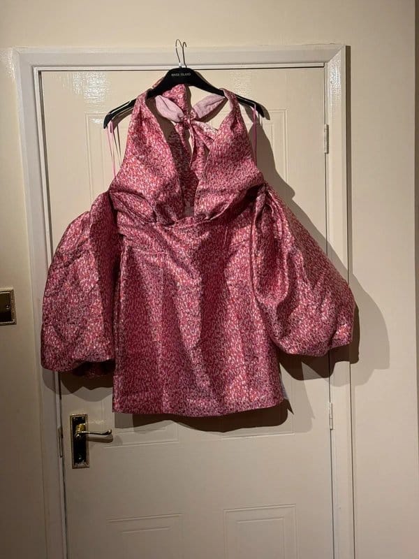 Vibrant pink animal print mini dress with a halter neckline and puff sleeves. The fitted bodice transitions into a flared skirt, perfect for evening events.