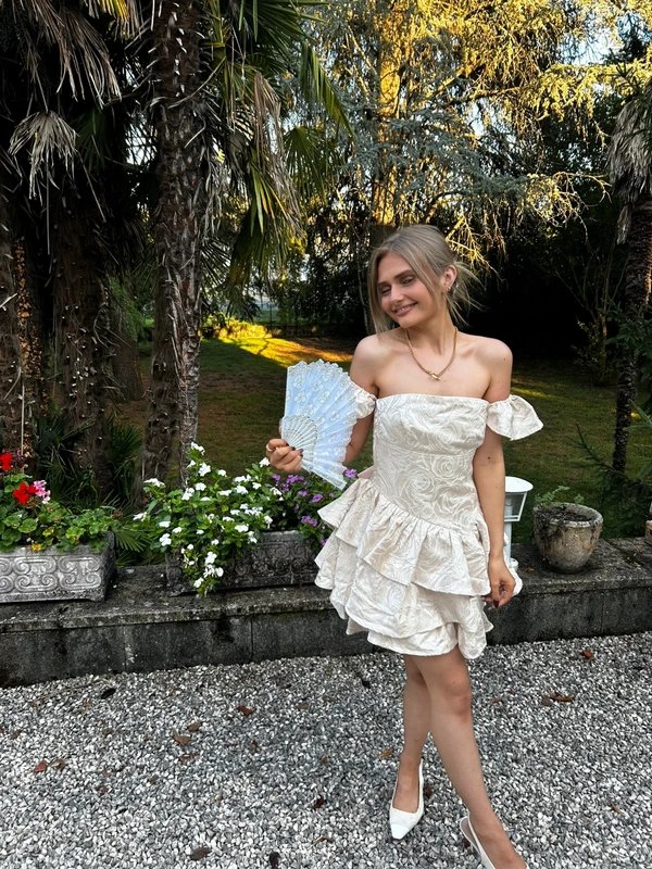 Cream Rose Jacquard Bandeau Mini Dress — the perfect choice for themed parties and special occasions. Designed in a cream and rose jacquard pattern, this bandeau mini dress features a zip fastening, cute bow detail at the back, and a flattering fit for sizes 6-8. Crafted from lightweight jacquard fabric, it offers a chic and elegant look for any event. Includes a full-length jersey slip lining for comfort and coverage.