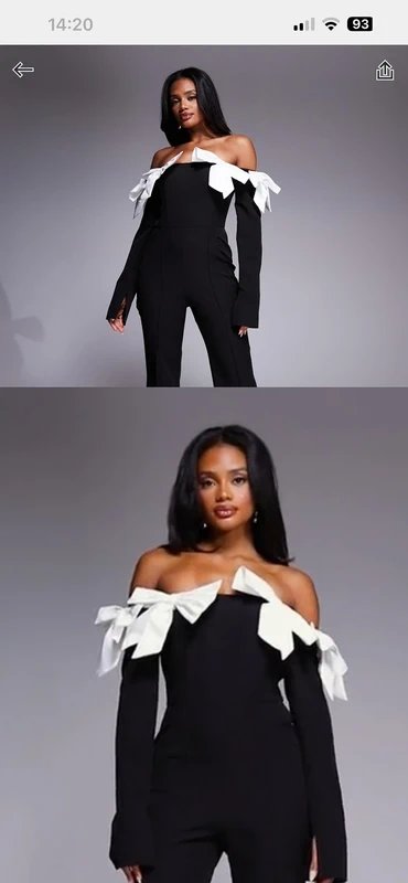 This ASOS Luxe Black Jumpsuit with white bows is a standout piece for any occasion. The off-the-shoulder neckline and long sleeves add a touch of elegance, while the full-length pants provide a sleek silhouette. Crafted from lightweight fabric, it offers comfort and style. Perfect for evening events and special occasions, this jumpsuit is sure to turn heads.