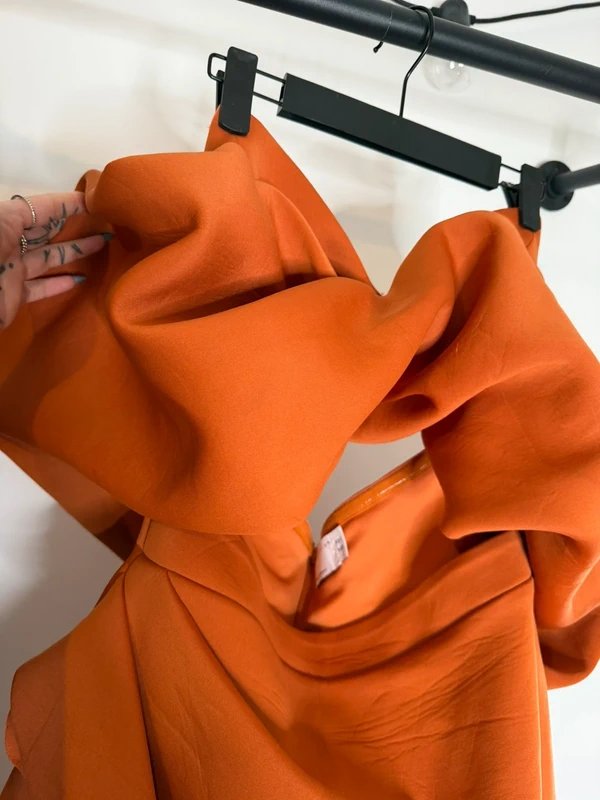 Burnt Orange Off-Shoulder Dress — the perfect choice for special occasions. Designed in vibrant burnt orange, this off-the-shoulder dress features a cropped out center, an open slit at the side, and sticky straps for a secure fit. Crafted from a thick yet light material, it offers a flattering silhouette. Ideal for weddings and formal events.