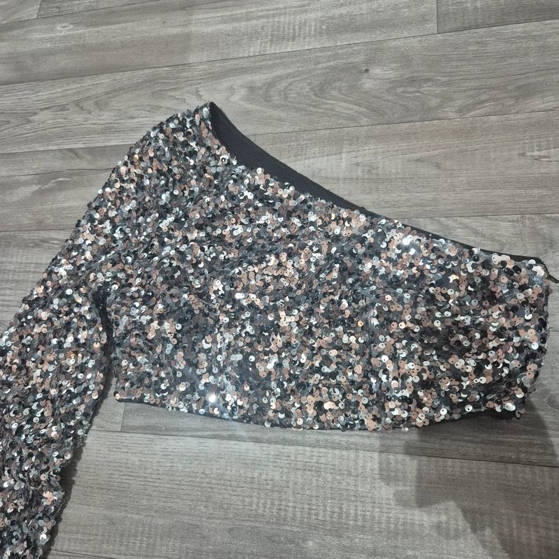 Featuring a one shoulder neckline with maxi sleeves and a side zip fastening, this crop top is crafted from silver and rose gold sequins. It has a soft black lining with a slit up the sleeve, making it ideal for a party or Christmas.