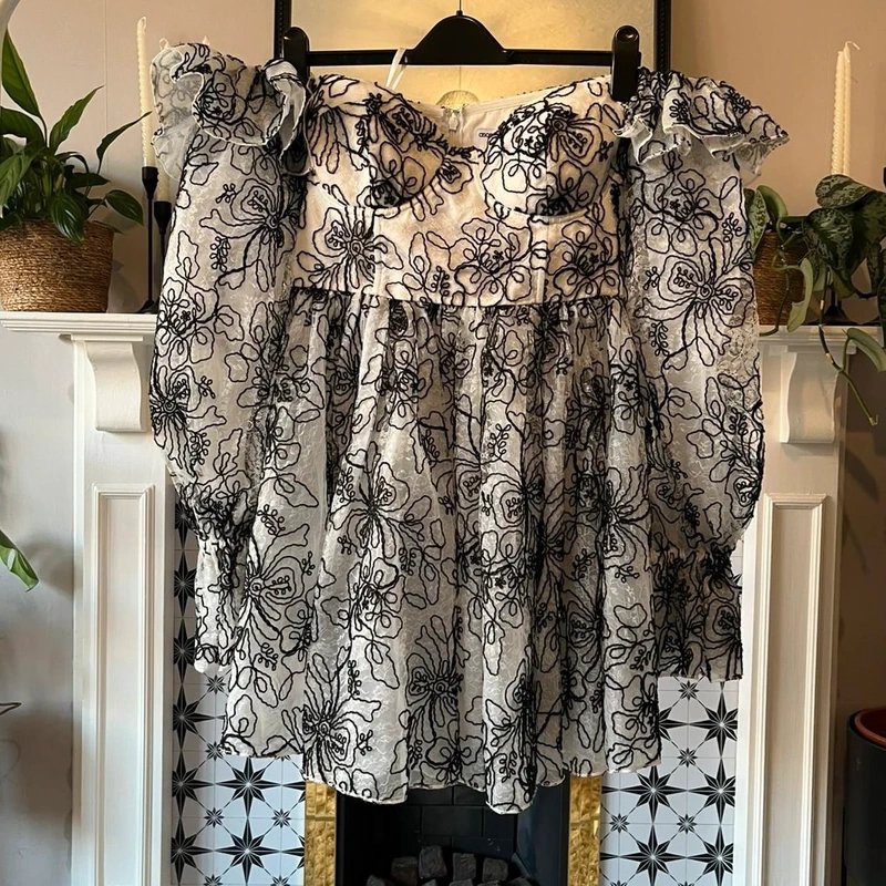 White and black floral embroidered organza mini dress with off-shoulder long sleeves and a boned front corset body. Perfect for evening events and special occasions.