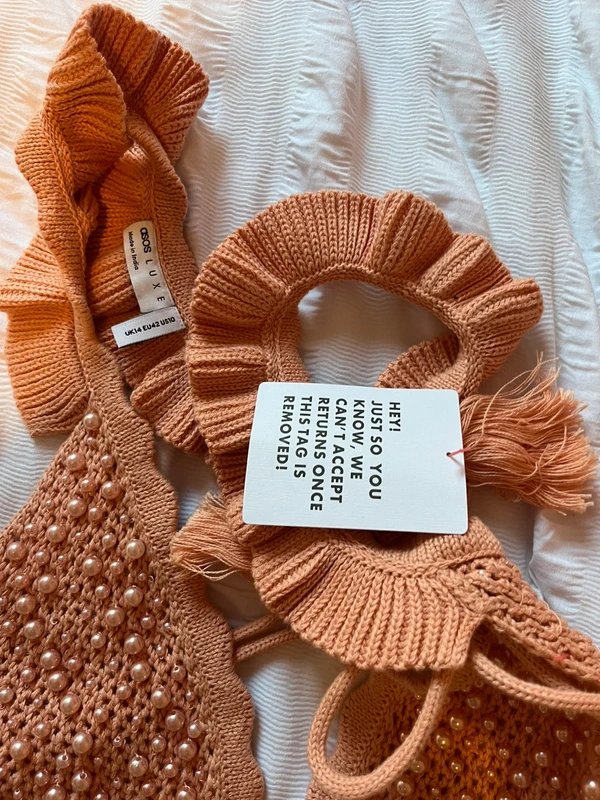 Apricot Pearl Embellished Bralette — the must-have occasion piece for special events. Designed in Apricot, this pearl embellished bralette features a knitted texture with pearl detailing and fringe trims. Perfect for adding a touch of glamour to any outfit. Includes a full-length jersey slip lining for comfort and coverage.