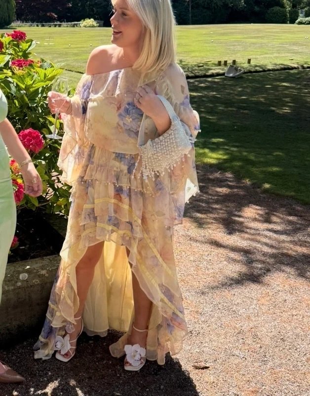 Designed in buttermilk/yellow, this off-shoulder maxi dress features long sleeves and a high-low hem. The regular fit and elasticated waist provide a comfortable and flattering silhouette.