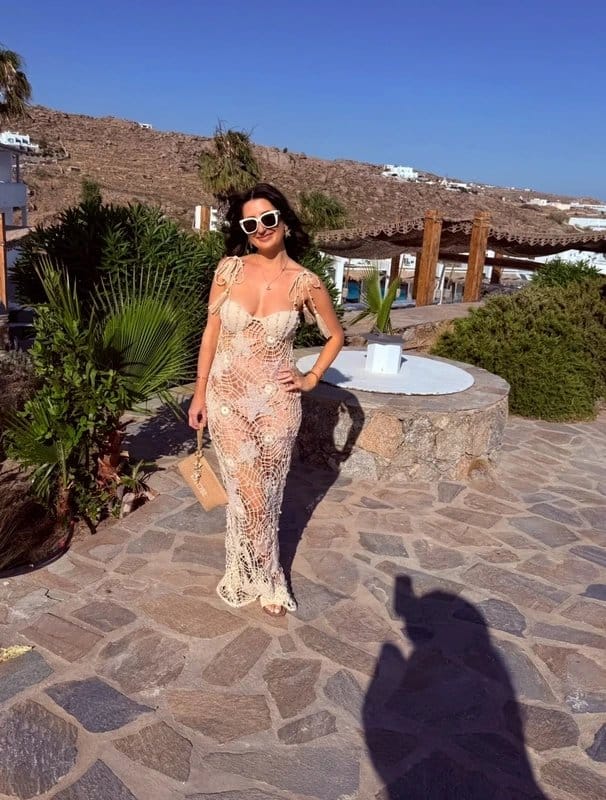 This maxi dress features pearl embellishments and starfish crochet, available in cream and pink. Perfect for special occasions, the elegant design and flowy fabric add a touch of glamour.
