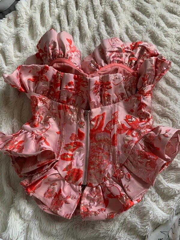 This pink floral corset top by ASOS Luxe features a corset-style construction with elaborate floral embroidery and metallic accents. The bodice is structured with boned panels and a zip closure at the back. Ideal for a glamorous evening look.