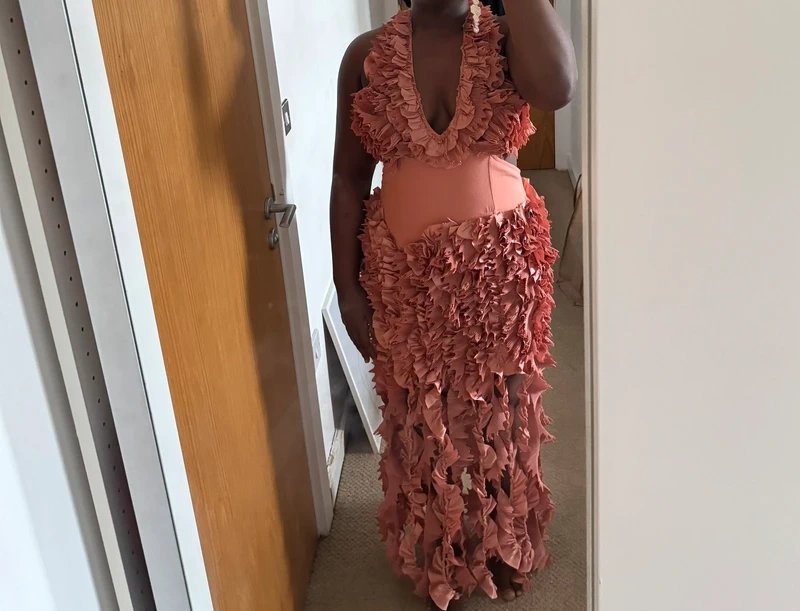 Designed in dusty pink, this halter neck maxi dress features ruffled drape details for a dramatic flair. Perfect for evening events or special occasions.