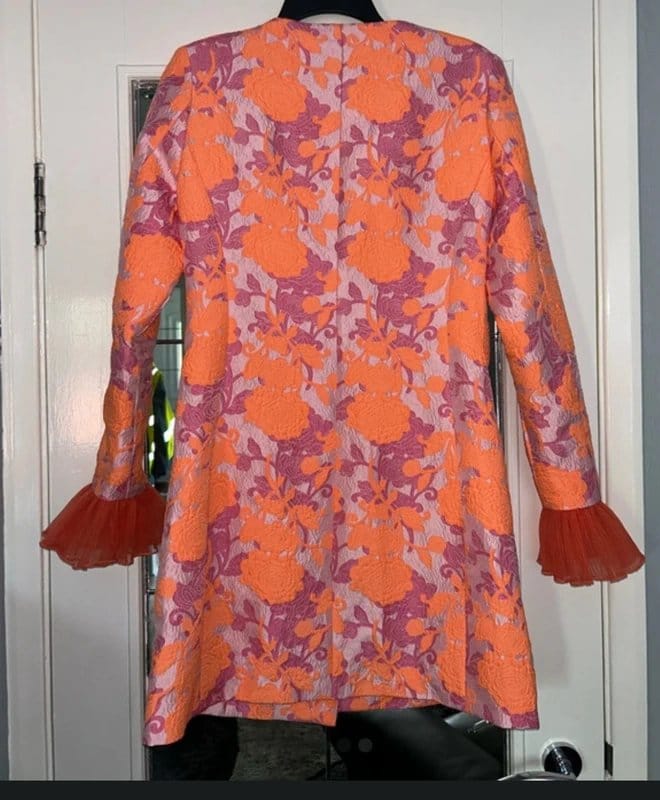 Gorgeous ASOS Luxe blazer dress featuring a deep plunge neckline, chiffon sash tie at the waist, and matching chiffon cuffs. Stunning floral jacquard fabric – elegant, unique, and perfect for special occasions.