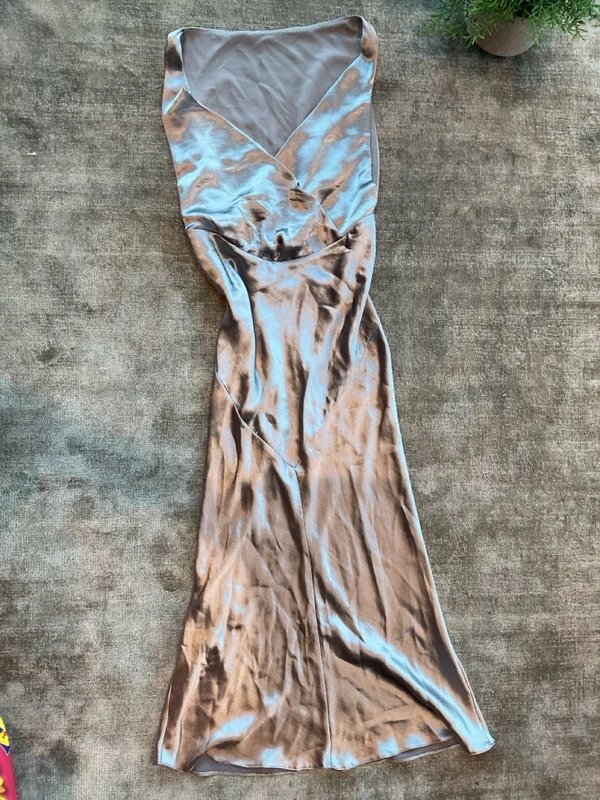 The ASOS Luxe Prom Slip Silver Silk Midi Backless Dress is available in sizes L.