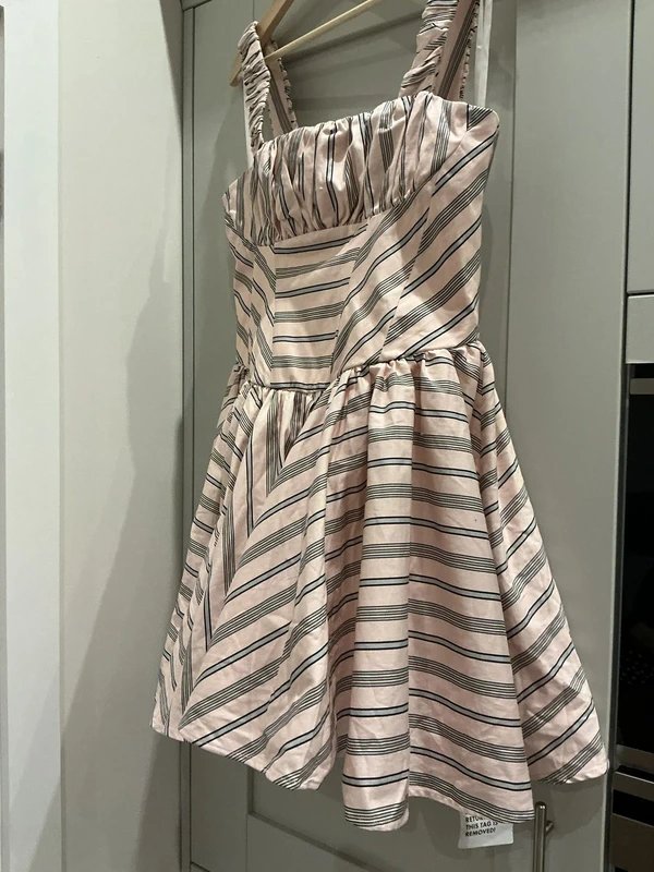 This soft blush pink striped ASOS dress features a structured boned bodice and ruched shoulder straps. It has a full skater-style skirt with netting underneath for added volume and shape. Fully lined, it offers a flattering fit and is perfect for parties, events, or summer occasions.
