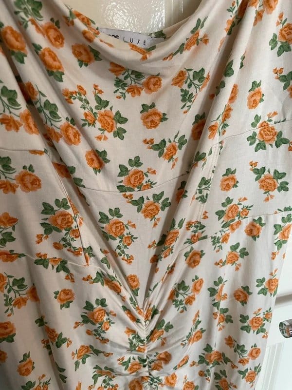 Cream and orange floral Ruched Dress by ASOS Luxe. Designed with a ruched silhouette and floral print, this dress is perfect for casual outings and daytime events. Crafted from lightweight cotton, it offers a comfortable and breathable feel. Features a round neckline and short sleeves, making it ideal for warmer weather.