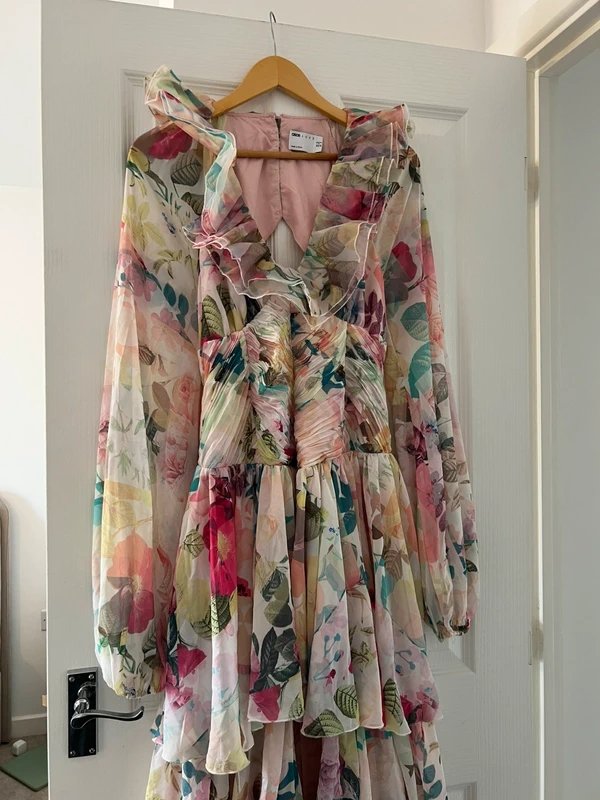 The ASOS Luxe Ruffle Maxi Dress with Floral Print is available in sizes L.