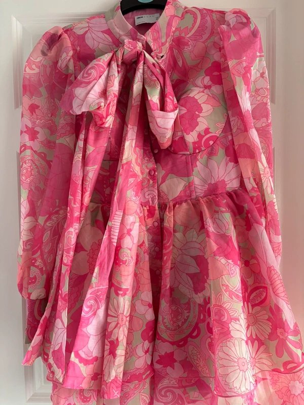 The ASOS Luxe Pink Floral Mini Dress with Detachable Bow is available in sizes M.