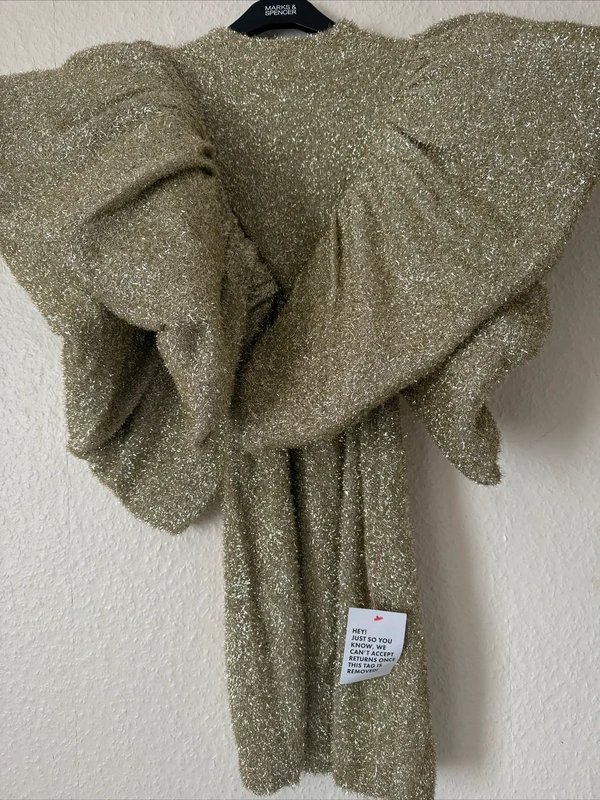The ASOS Luxe Ruffle Shoulder Knitted Lurex Dress in Gold is available in sizes S.