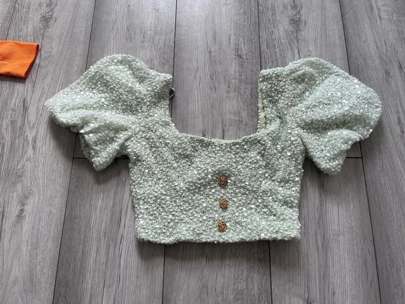 This sequin crop top is perfect for a stylish and eye-catching look. The mint color adds a refreshing touch, while the sequin detailing enhances the overall glamour.